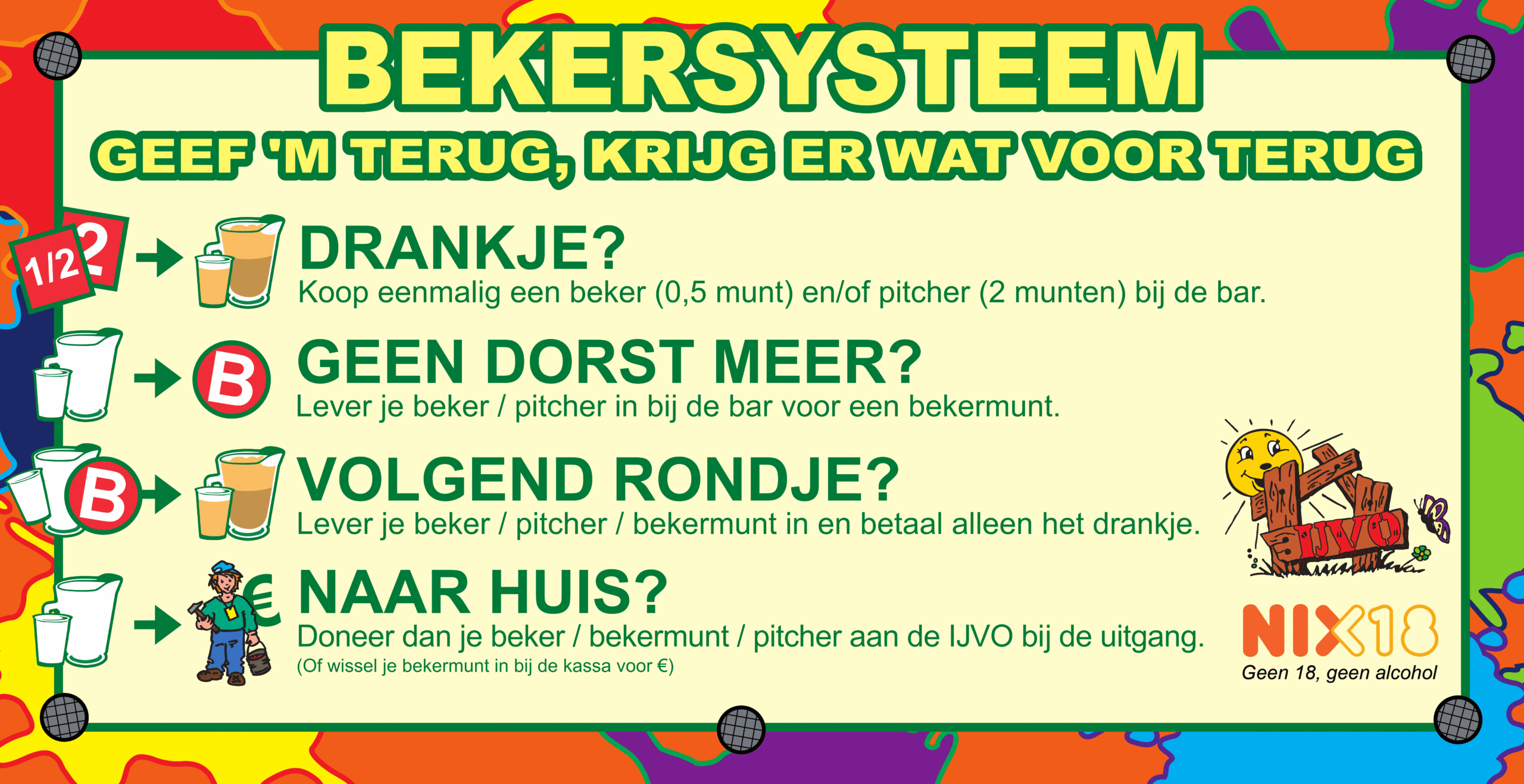 De IJVO werkt op de vrijdagavond met een bekersysteem. Hieronder hebben we deze uitgelegd. Graag zien wij uw beker aan het einde van de avond als donatie retour, zodat wij volgend jaar weer een fantastische IJVO-week kunnen organiseren!